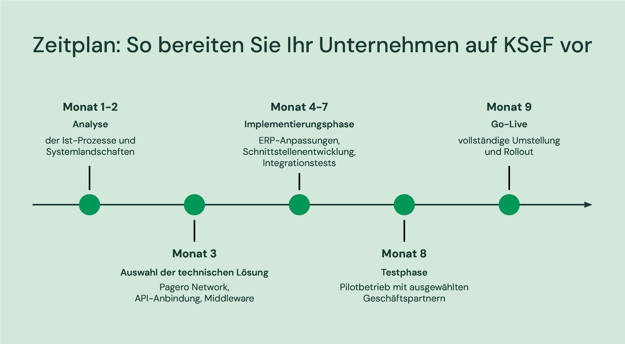 - Ressourcenplanung: Die Einführung von KSeF erfordert interne Ressourcen für IT-Anpassungen, strukturierte Tests und Schulungen. Branchenerfahrungen zeigen, dass für eine umfassende Implementierung des elektronischen Invoicings über KSeF in der Regel sechs bis neun Monate einzuplanen sind.